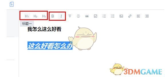选中你想要调整的文字,然后点击上方红框标注内的前三个选项,它们分别代表标题一、标题二和标题三,可以帮你调整字体大小。右边的两个选项则可以调整字体的粗细和斜体样式。
