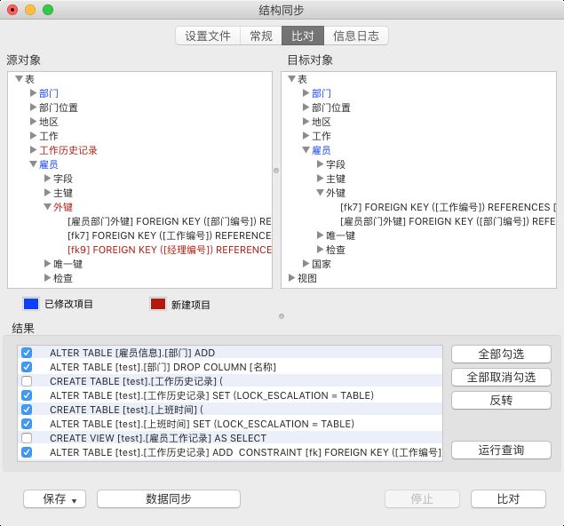 答:数据同步功能可以清晰显示所有比较结果,并用颜色标注不同条件,让用户轻松分辨源记录和目标记录的差异,还可以重新安排部署脚本。