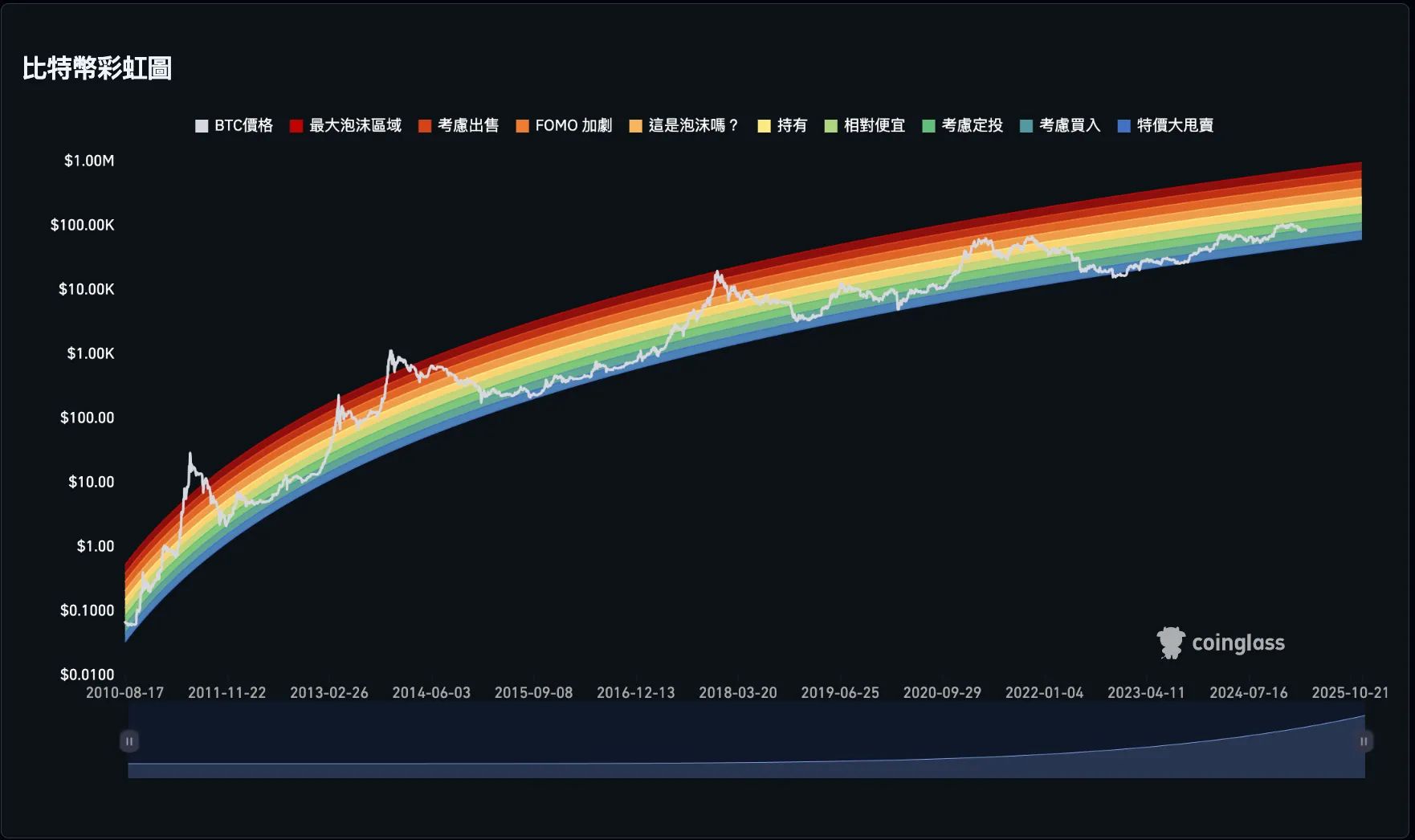 比特币彩虹图是一个长期估值工具,使用对数成长曲线来预测比特币潜在的价格走向。当价格到达较暖色区域时,表示市场可能过热,是获利的好时机;当价格跌至较冷色区域时,市场情绪低迷,通常是增持比特币的好时机。这个图表每24小时更新一次,能即时反映最新的每日收盘价。