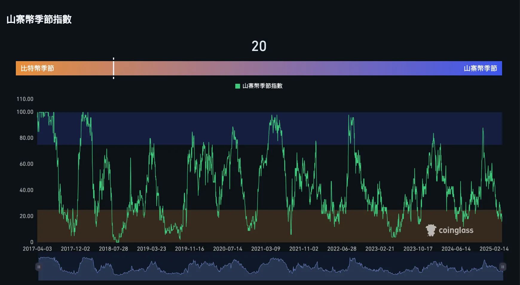 - 指数≤25:市场资金集中在比特币,山寨币表现疲弱,尚未进入山寨季。