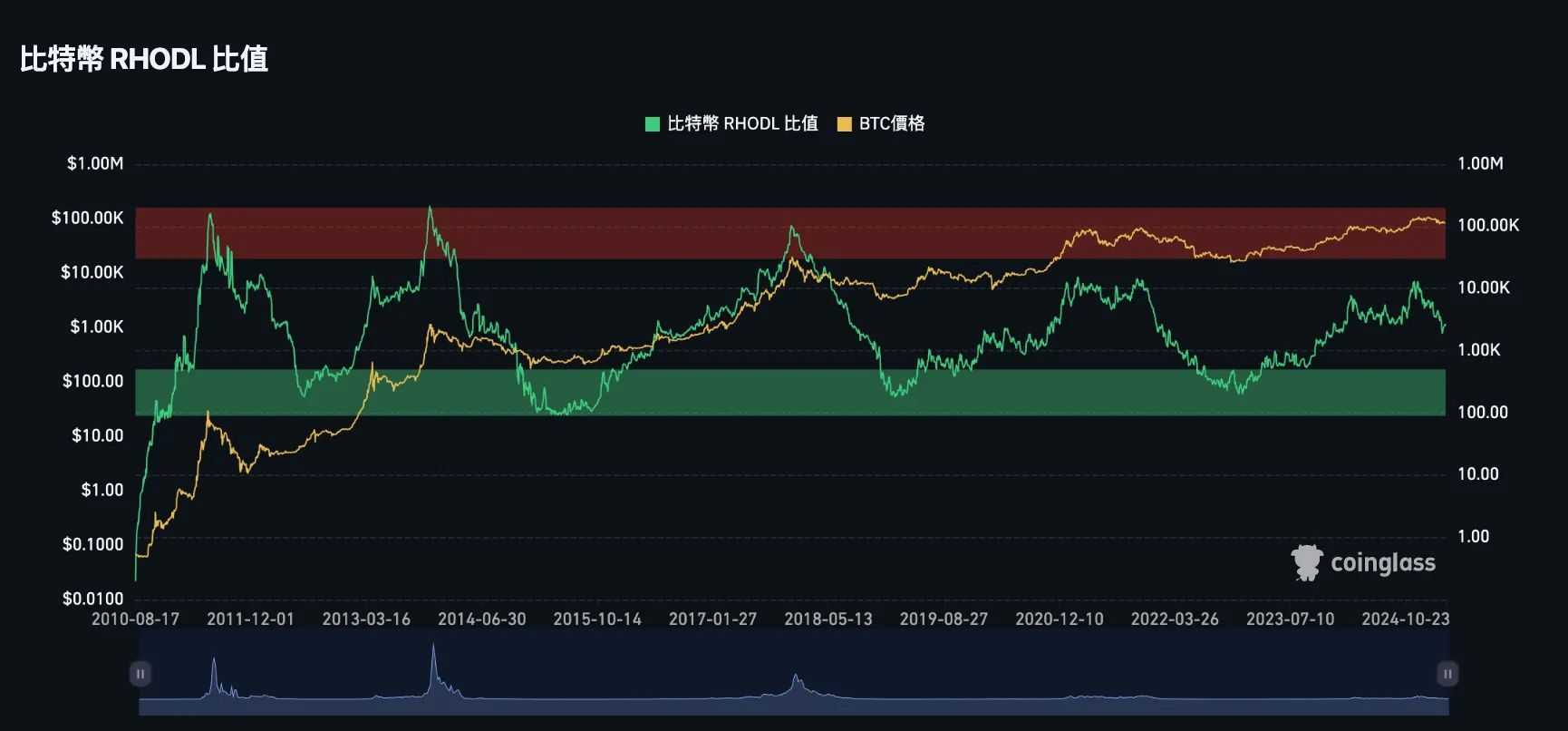 牛市逃顶参考为≥10000,当前状态值为2682,RHODL比值远低于逃顶区,短期资金虽然逐渐活跃,但尚未大举主导市场,长期持有者仍具稳定力量。