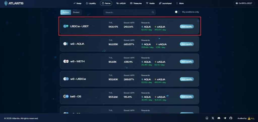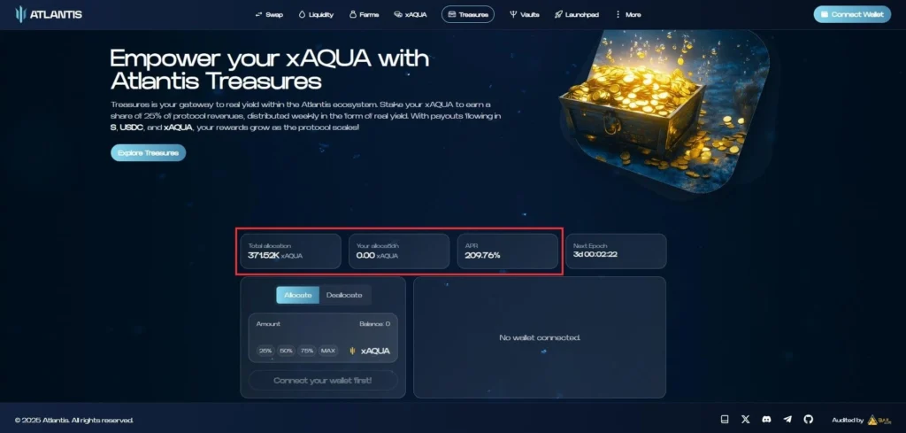 Atlantis的Treasures功能将实际收益发放给质押平台币的参与者。奖励通过$S、$USDC和$AQUA三种代币发放,没有提取限制,任何金额、任何时间都可以领取。目前,Atlantis平台共有371,520枚$AQUA处于质押状态,价值约25万美元,质押年化APR约为209%。不过,由于平台参与者还不多,这个数据只能作为参考。