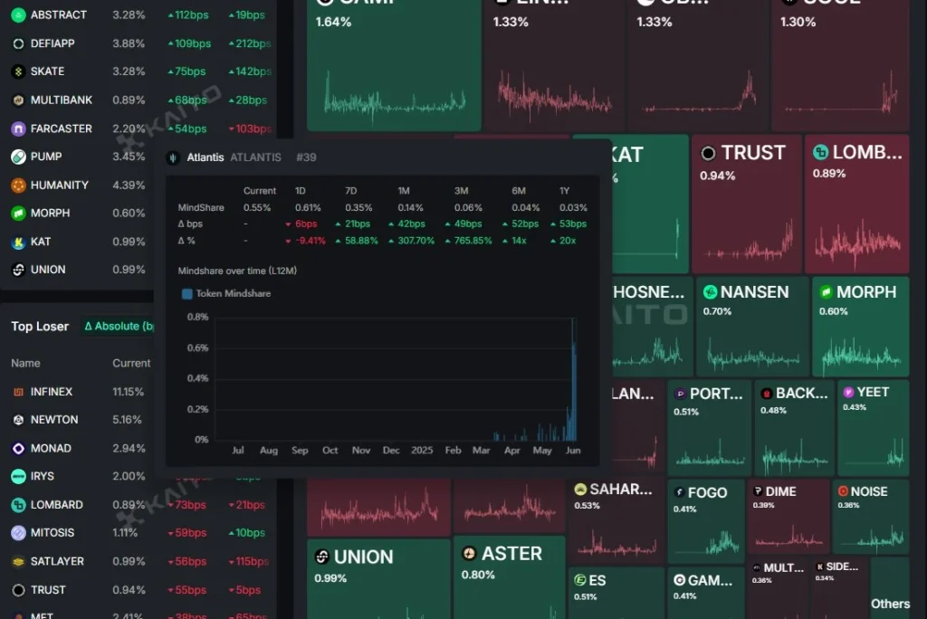 Atlantis的热度也不容小觑。在平台币公售期间,它曾经登上KaitoAI排行榜第39名,这表明它吸引了相当多的关注。正是这份热度让早期项目SynapGG决定把发射平台从Virtual迁移到Atlantis。