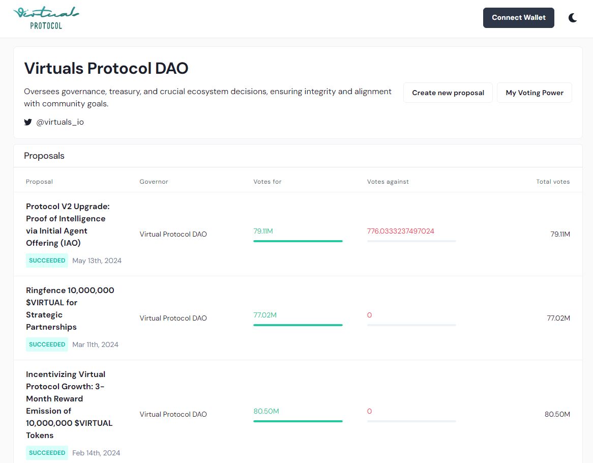 在Virtuals Protocol平台上,每个AI代理代币创建都需要锁定一定数量的$VIRTUAL代币,这些代币用于建立代理代币的流动性池子,锁仓期为10年。并且,如果用户需要购买该平台上的任何代理代币,必须通过$VIRTUAL作为交易路径,以此来持续产生对$VIRTUAL代币的实际需求。此外,用户持有和质押$VIRTUAL还可以参与DAO治理。