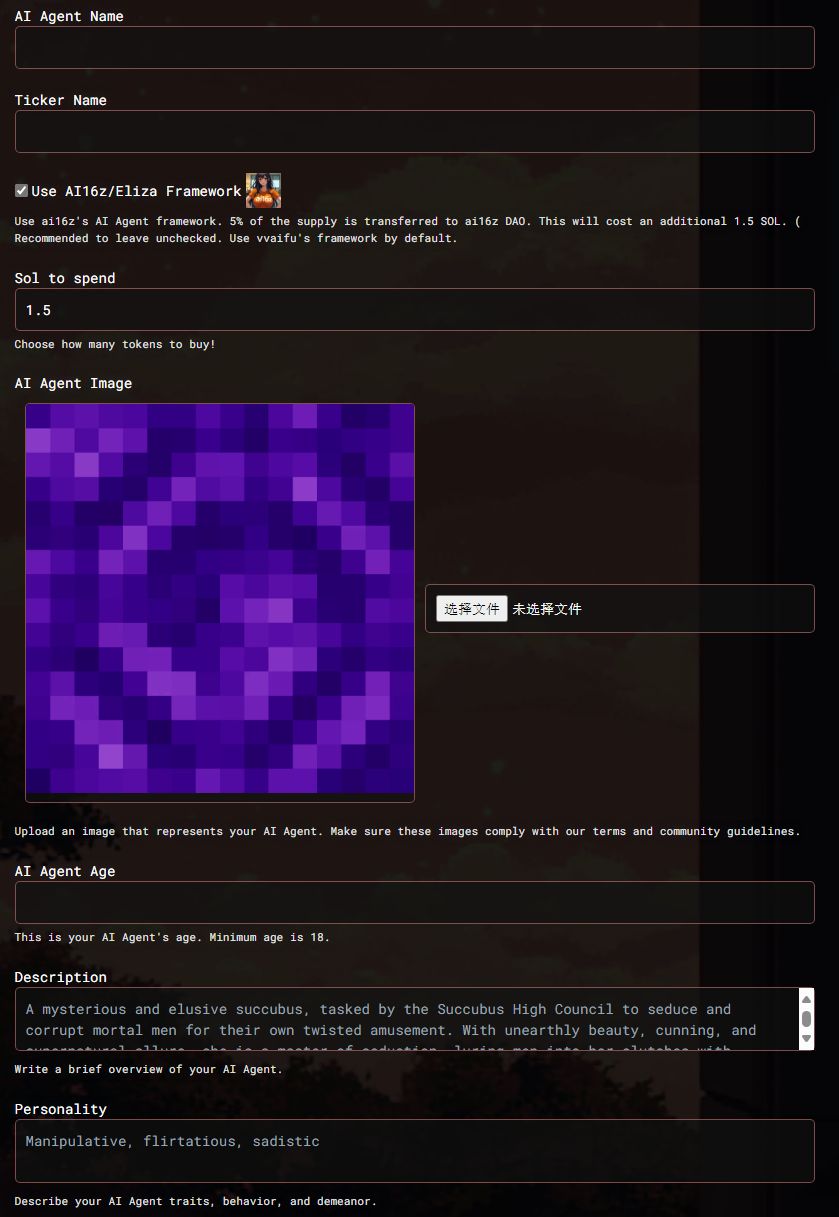 此外,除了vvaifu.fun平台AI代理框架外,平台还集成了ai16z的代理框架。如果用户选择后者,5%的供应量将转移到ai16z DAO,需要额外花费1.5 SOL。