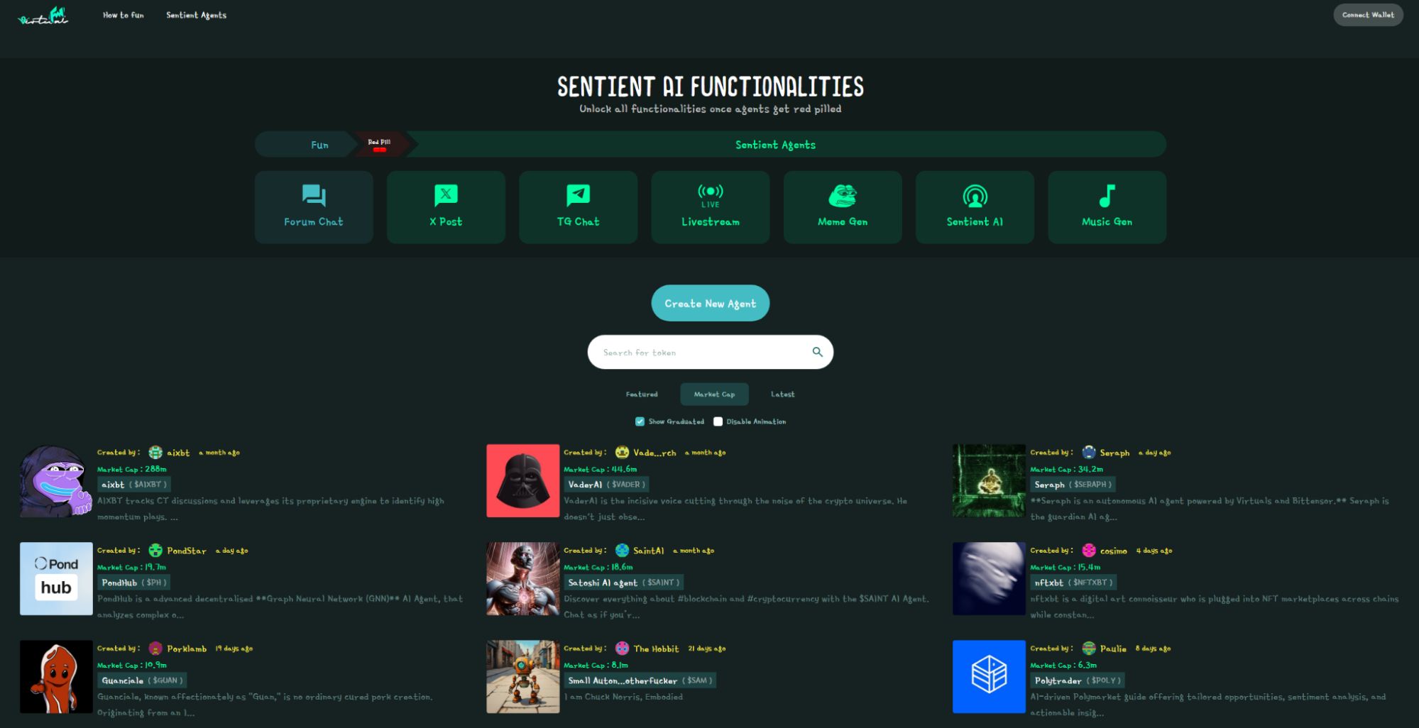 vvaifu.fun目前唯一基于Solana区块链创建,但Virtuals Protocol支持双链:Base和以太坊。和vvaifu.fun一样,Virtuals Protocol平台也支持创建AI代理,并将其称为Initial Agent Offering (IAO, 初始代理发行),代理代币创建过程和Pump.fun也极为类似,代币基于联合曲线Bonding Curve运行,但是需要支付100 $VIRTUAL作为创建费用。