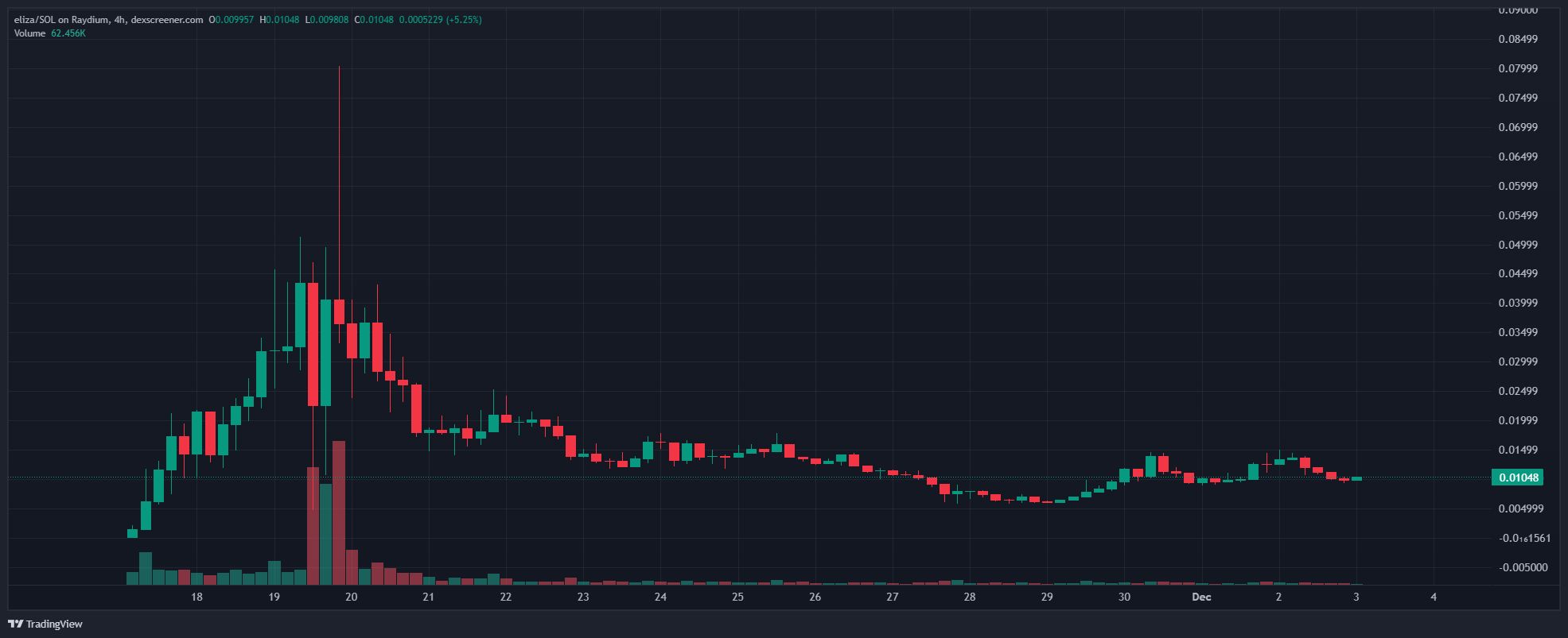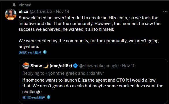 - 2024年11月19日,$VVAIFU创下历史新高后开始下跌。同一天,ai16z合伙人Shaw(@shawmakesmagic)发文否认$eliza属于ai16z,并且重新发布了一个新币$ELIZA。尽管$ELIZA代币将为原$eliza代币持有者预留10%的空投份额,但此举仍然遭到了社区的强烈批评,eliza也发声表示强烈不满。受此消息影响,$eliza价格暴跌,目前市值仅维持在1,000万美元左右。