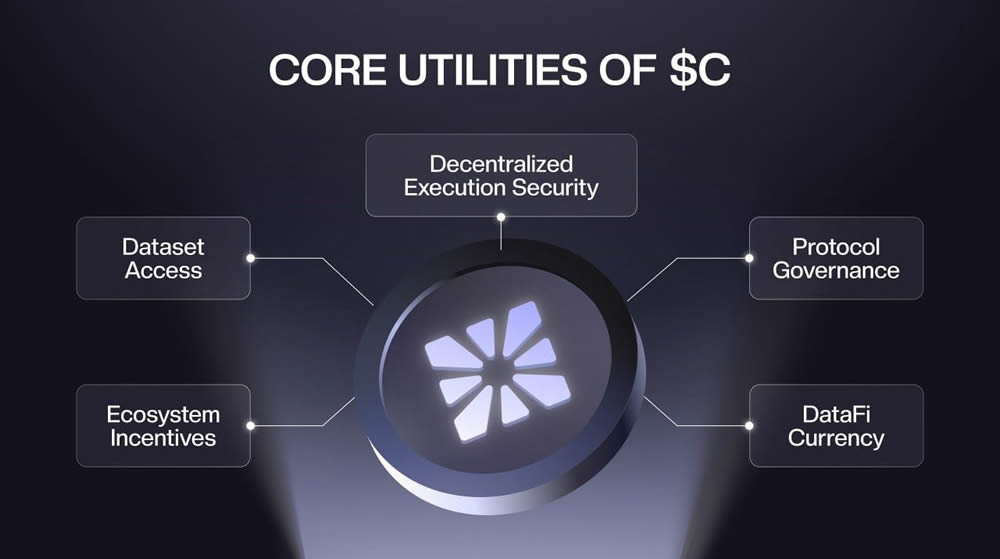 答:C代币有多种用途,包括:数据集访问(供智能合约、AI代理和DApp查询数据);激励生态系统(奖励开发者、数据贡献者等);安全的去中心化执行(质押保护系统);平台治理(代币持有者参与投票);以及作为DataFi支付单位。