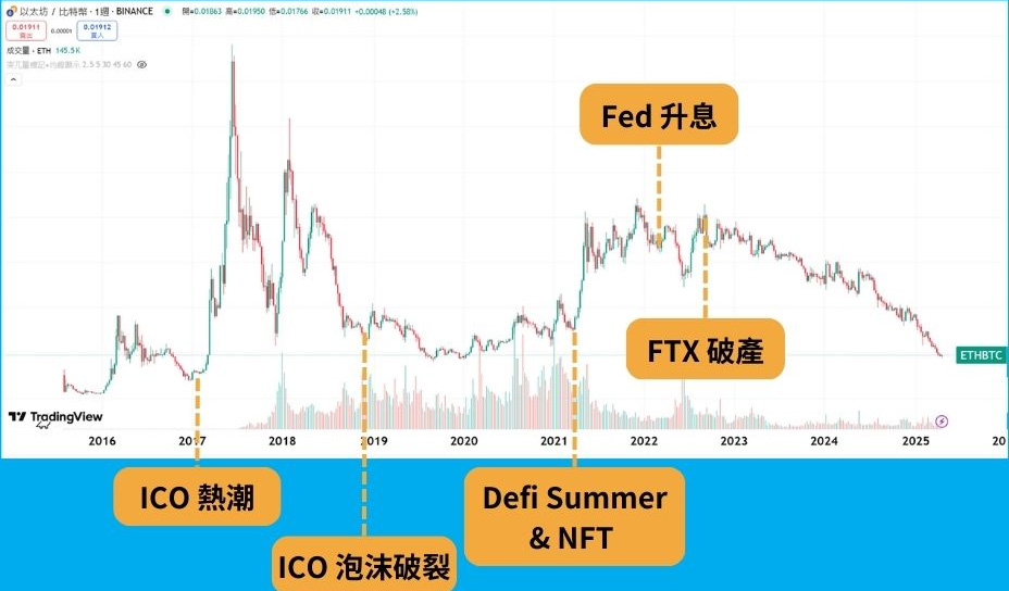 通过ETH/BTC这个比率,投资者可以用传统金融分析的视角,更好地理解加密市场的资金动向和信心变化。