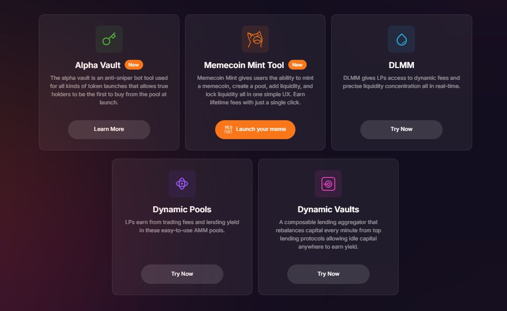 Meteora专注于在加密领域提供流动性,旨在创建一个庞大的流动性提供者社区。它提供去中心化流动性管理的工具,包括自动化交易、手续费分析以及针对代币发行的反狙击机器人保护。其主要产品包:DLMM(动态流动性管理模块)、动态池、动态金库、多代币稳定池、非锚定稳定池、集成锁仓流动性的memecoin铸造服务等。Meteora还举办社区活动和教育训练营,以帮助流动性提供者(LP)在像Solana这样的平台上获得最大化收益。