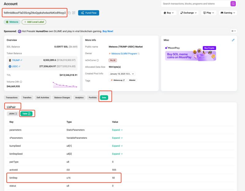 在solscan上打开池子地址9d9mb8kooFfaD3SctgZtkxQypkshx6ezhbKio89ixyy2(https://solscan.io/account/9d9mb8kooFfaD3SctgZtkxQypkshx6ezhbKio89ixyy2),点击【data】标签页,在"LbPair"切换成"Table",可以查到binStep的值为50,如图