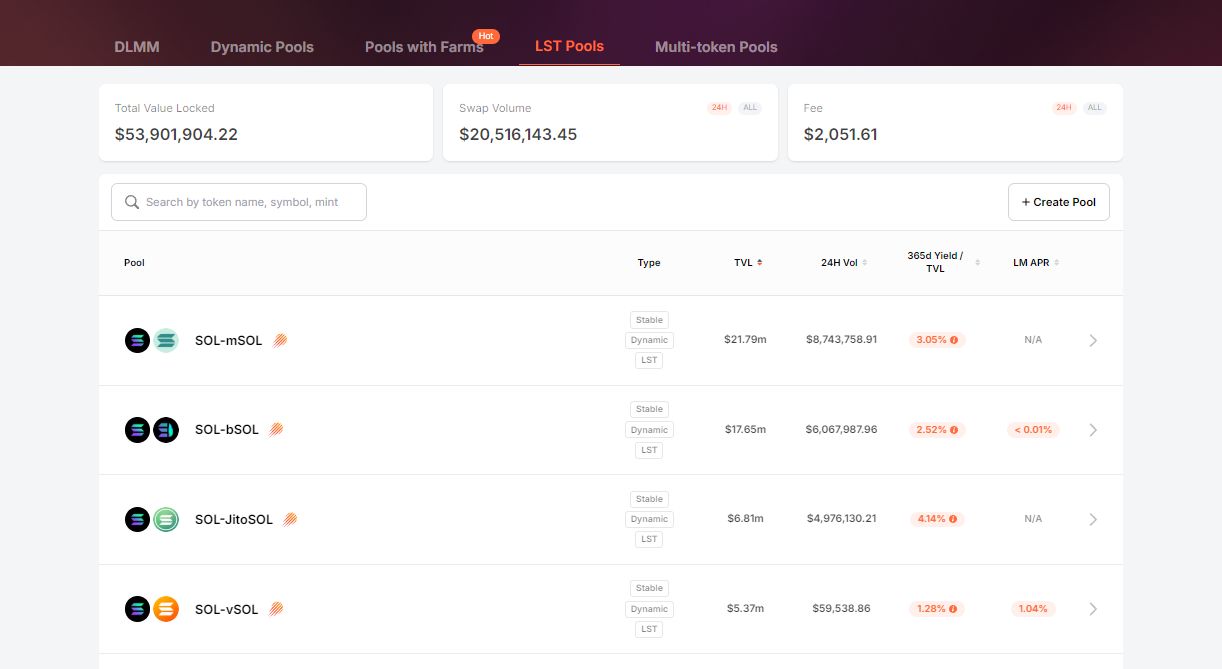 Meteora的LST(Liquid Staking Token)流动质押代币池旨在用于支持那些由于质押收益不断分发而导致其价值变化的代币,例如bSOL、mSOL、LST或JitoSOL,这些代币通常与SOL配对交易。这些池主要通过提供质押代币的收益生成特性,使LST创造者、流动性提供者和用户受益。LST保护用户免受无常损失,并通过链上程序提供更稳定的价格,并避免使用第三方价格预言机。为了保护用户免受低滑点的影响,它采用稳定曲线AMM模型,将流动性集中,并优化通过像Jupiter这样的交换聚合器捕获的交易量,以便流动性提供者通过增加的交易活动赚取更高的费用收入。