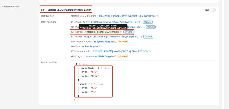 在交易详情页面往下查看,在【#4.1 - Meteora DLMM Program: initializePosition】可以知道lowerBinId为1062,bin的宽度即个数为46,池子地址为9d9mb8kooFfaD3SctgZtkxQypkshx6ezhbKio89ixyy2,如图。
