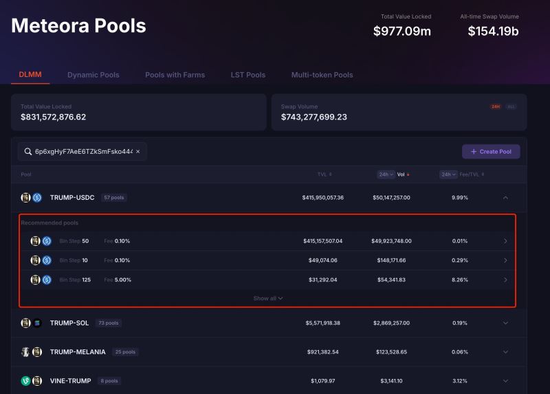 每个交易对下面可以有多个Pools,每个Pool按Bin Step和Fee(手续费)的不同来区分。比如trump-usdc的交易对下面就有57个Pools,每个Pool都对应一个唯一的地址,如图