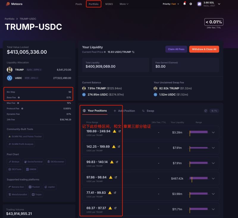 最后,打开Meteora连接Phantom钱包,点击顶部的【Portfolio】就能看到所有添加的池子,点击DLMM的任意一个池子,会显示池子的详情和所有的仓位,如图