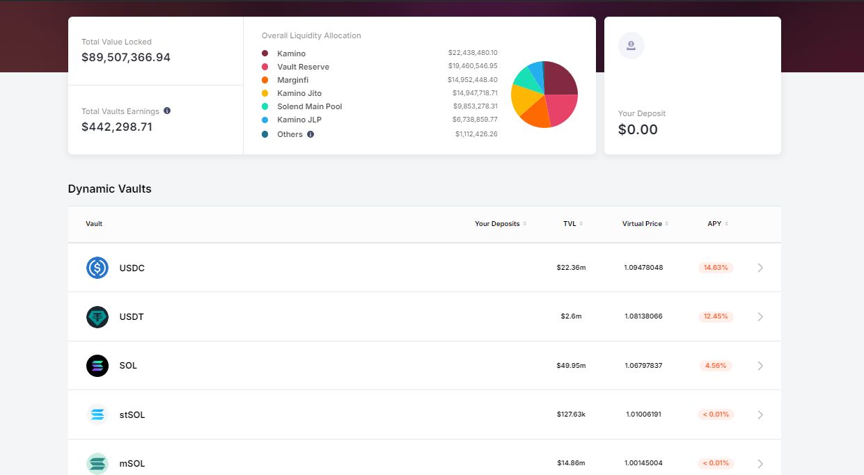 下图显示了来自不同分配器(如Kamino、Vault Reserve和Marginfi)的金库中锁仓的价值。它包括特定代币的总锁仓价值(TVL)、虚拟价格以及计算的年化收益率(APR)。