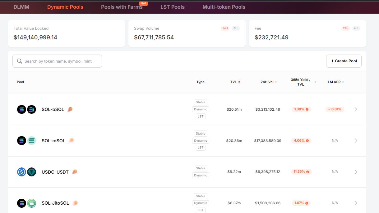 除了LP提供者,Meteora还为希望创建自己代币池的项目提供无需许可的动态池,这样避免了对第三方的依赖,能享有更大的灵活性、控制权和透明度。为了提供更好的奖励,Meteora实施了三种类型的池: