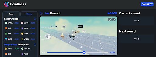 不确定怎么参赛?别担心,CoinRaces为桌面和移动设备用户都提供了详细的游戏指南,你可以在他们的网站或GitBook文档中找到。游戏规则很简单:你根据对代币在两分钟比赛中的价格走势预测来选择一匹"马"(也就是迷因币或AI代币)。