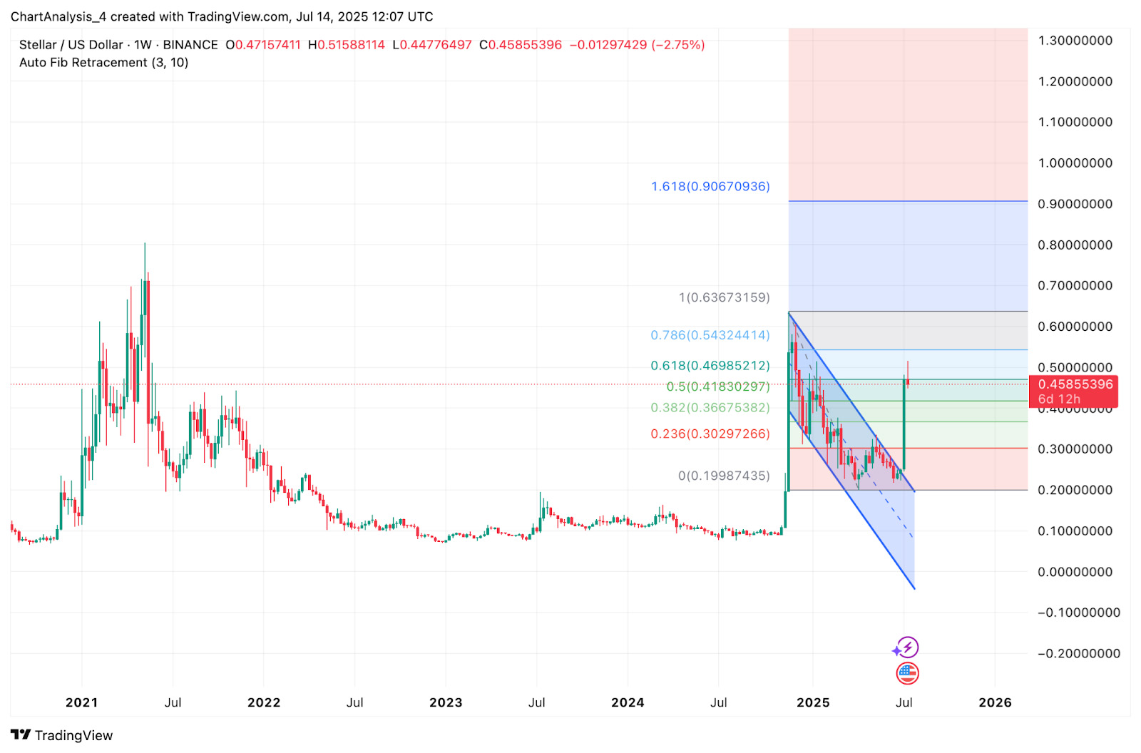 最近,恒星币(XLM)的市场表现相当亮眼,价格突破了关键阻力位,在经历了几个月的窄幅盘整后,迎来了一波强劲的上涨,目前已经将XLM推至0.46美元区域。随着价格突破主要的斐波那契水平,各项技术指标都显示出强劲的上涨势头,投资者们开始关注未来几年XLM可能达到的0.63-0.90美元区域。下面我们就来详细分析一下恒星币在未来几年的价格走势预测。