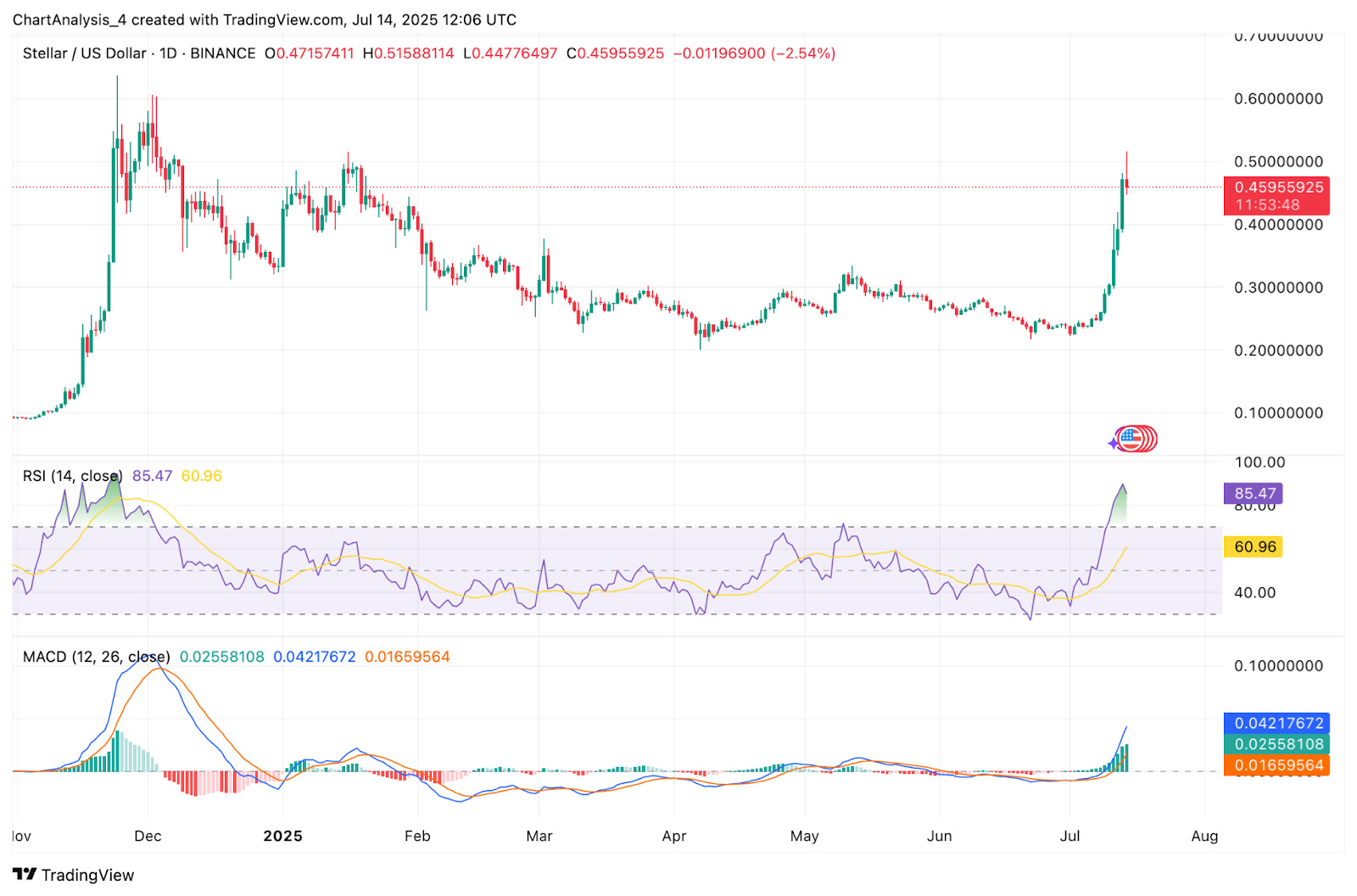 恒星币(XLM)已经突破了20日、50日和100日指数移动平均线,这些均线都呈现上升趋势。200日EMA位于0.276美元附近,成为长期支撑位。RSI指标为85.4,显示暂时超买,MACD指标确认了上涨趋势的强度。