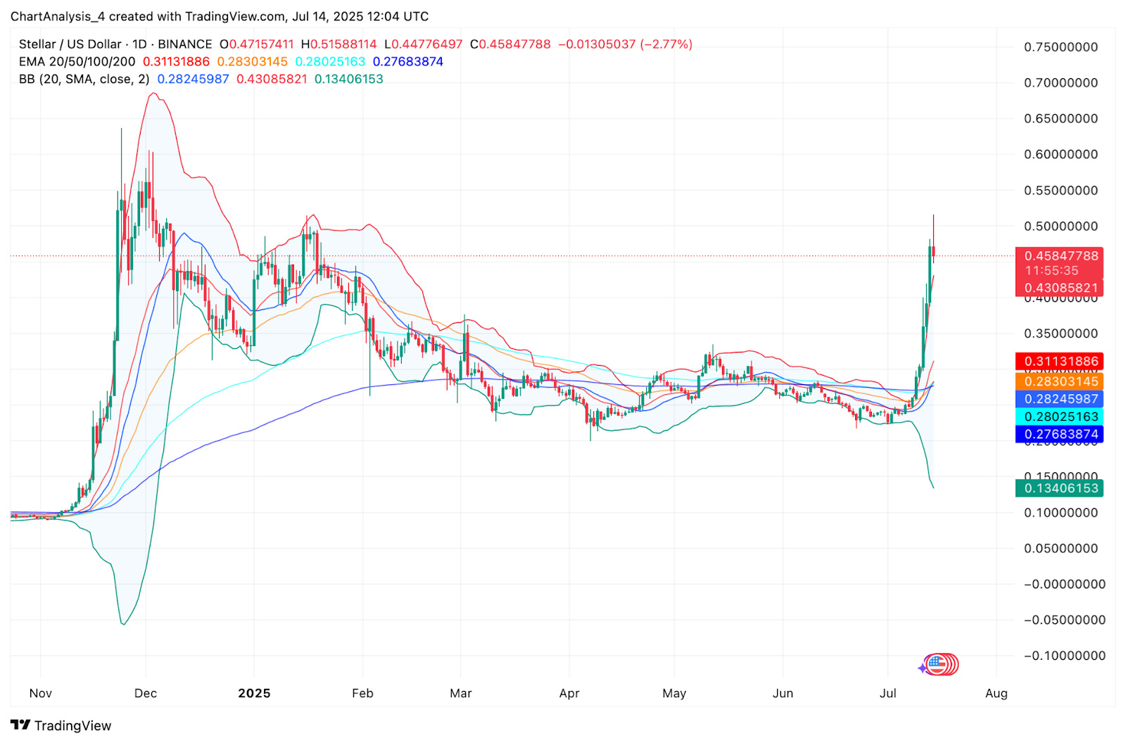 恒星币(XLM)最近突破了关键阻力位,在数月的窄幅盘整后迎来了一波强劲上涨,目前已经推至0.46美元区域。价格突破了主要的斐波那契水平,各项技术指标都显示出强劲的上涨势头。