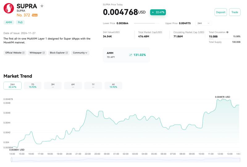 答:截至2025年7月14日,SUPRA的价格为0.004768美元,24小时变化为+22.47%。 - 问:SUPRA的总供应量是多少?