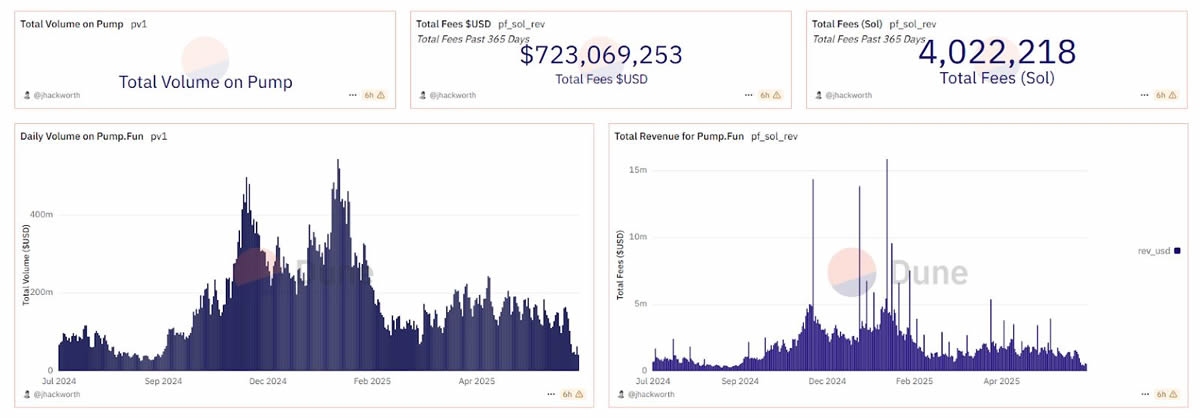 Dune的仪表板显示,Pump.fun在过去365天内产生了超过7.23亿美元的费用(等值美元),反映了其爆炸式增长和用户活动。这些收入主要来自代币发行,用户用Solana (SOL)支付少量费用来部署新代币,总共收取了超过400万SOL的费用。
