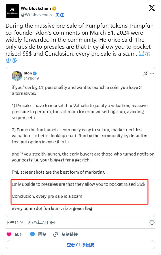在2024年3月一篇被广泛转发的帖子中,Pump.fun的创始人Alon严厉批评了代币预售:"预售的唯一好处就是可以让你把筹集到的钱装进口袋。结论是:所有预售都是骗局。"