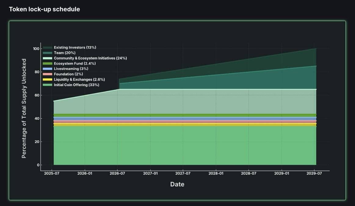 在2025年7月的代币生成事件(TGE)上,ICO销售、流动性和交易所、基金会、和生态系统基金的代币将完全解锁。社区和生态系统计划分配将在2025年7月至2026年7月的12个月内线性归属。团队和现有投资者的分配在第一年完全锁定,然后在五年内逐步释放。