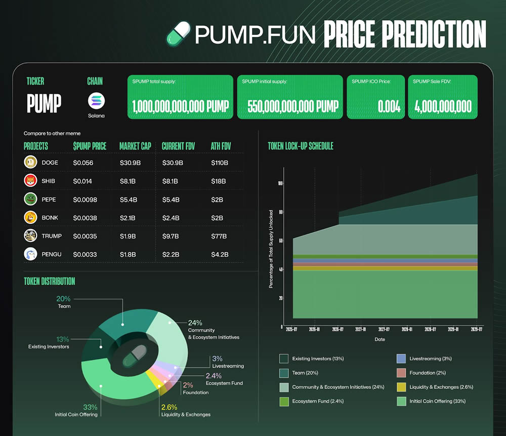 2025年7月12日,Pump.fun为其PUMP代币进行公开ICO,在六家交易所(Bybit、Kraken、KuCoin、Bitget、Gate、MEXC)及其链上平台以每个代币0.004美元的固定价格出售1250亿个代币(占1万亿总供应量的12.5%)。