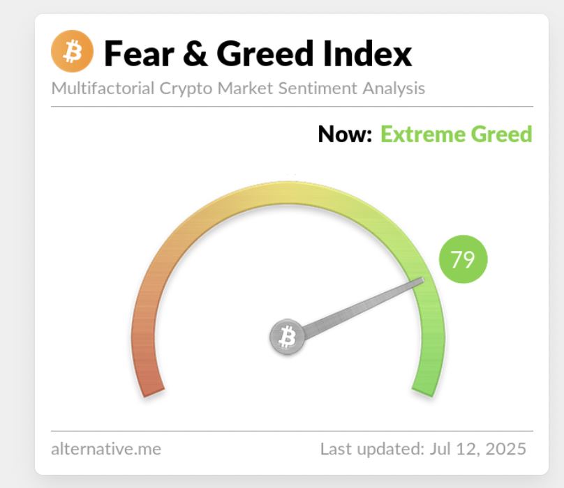 比特币近几日屡创新高,显著提振了市场情绪。根据Alternative的最新数据,加密货币恐惧与贪婪指数目前位于79,稳居"极度贪婪"区域。