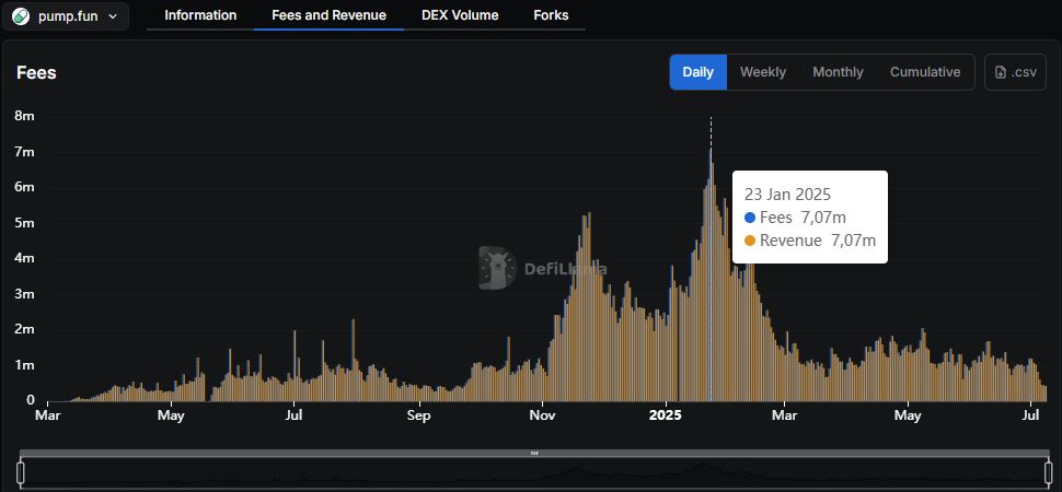 Pump.fun 每日收入 – 来源:DefiLlama