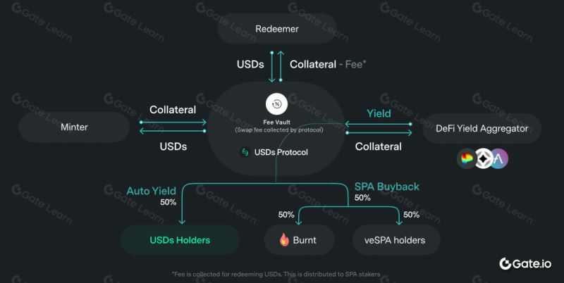 SPA的协议还整合了DeFi收益聚合器,使用户能够自动化地将资产部署到最有吸引力的收益挖矿机会中。USDs持有者可以通过收益聚合器从协议中获得被动收入,收益聚合器会将锁定的抵押品投资于高回报的收益挖矿项目。