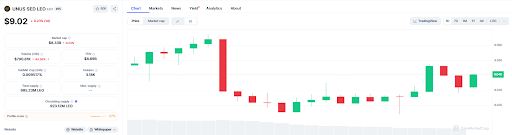截至2025年7月,LEO的交易价格约为9.02美元,市值达到83.4亿美元,在CoinMarketCap上排名第20位。历史数据显示,LEO曾达到10.01美元的最高点,相比这一高点,目前价格下跌了约9.7%。