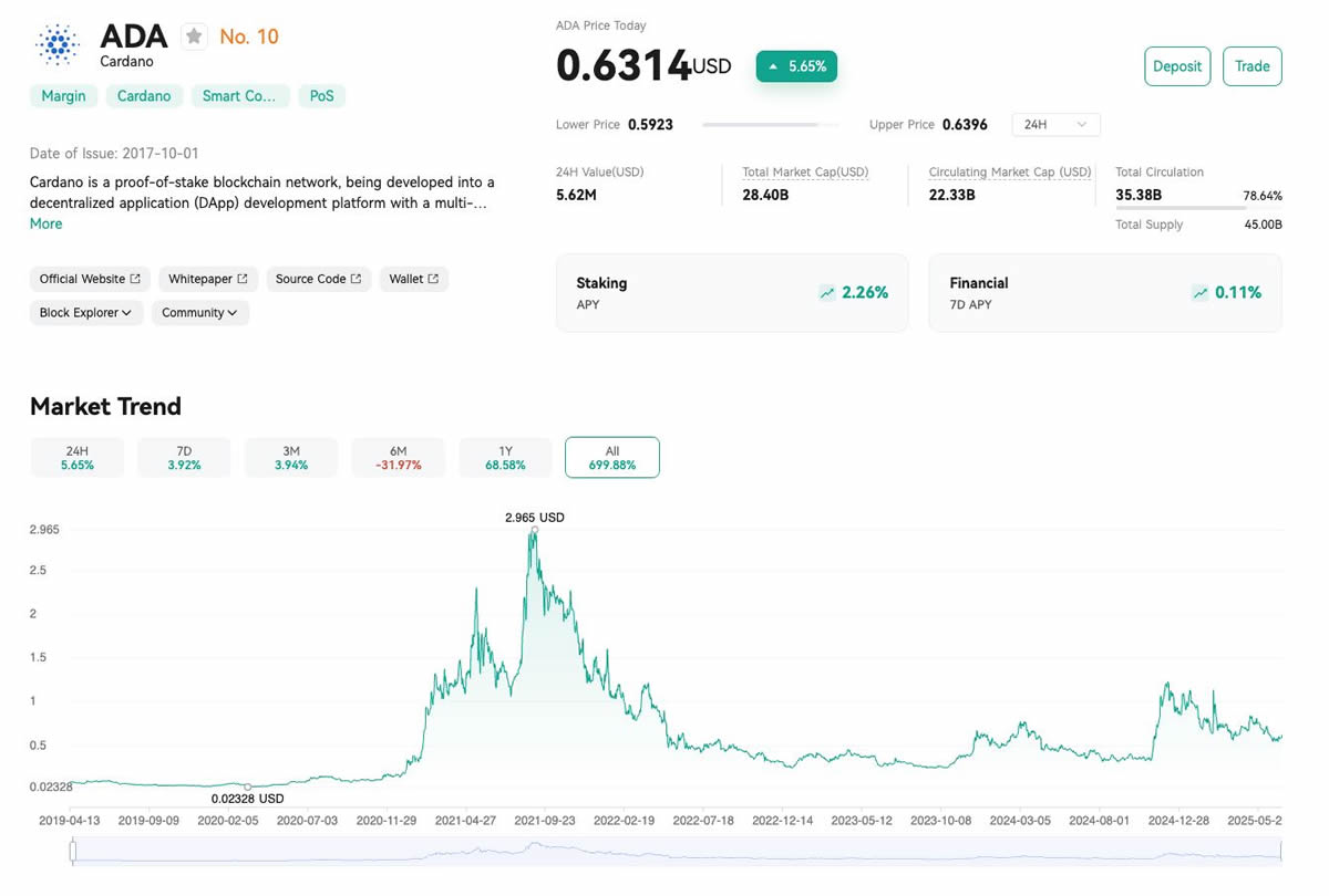 截至2025年7月,Cardano的基本数据如下: