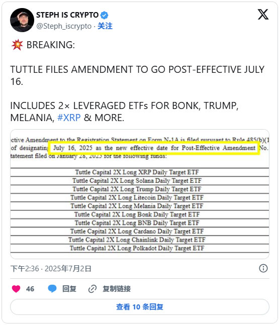 根据最新修订的申请文件,Tuttle Capital Management已正式申请推出BONK的2倍杠杆ETF,最早可能在7月16日获得批准。该ETF是其更广泛的杠杆产品系列的一部分,其中包括与特朗普、梅拉尼娅和XRP相关的产品,旨在为传统投资者提供增强的数字资产敞口。