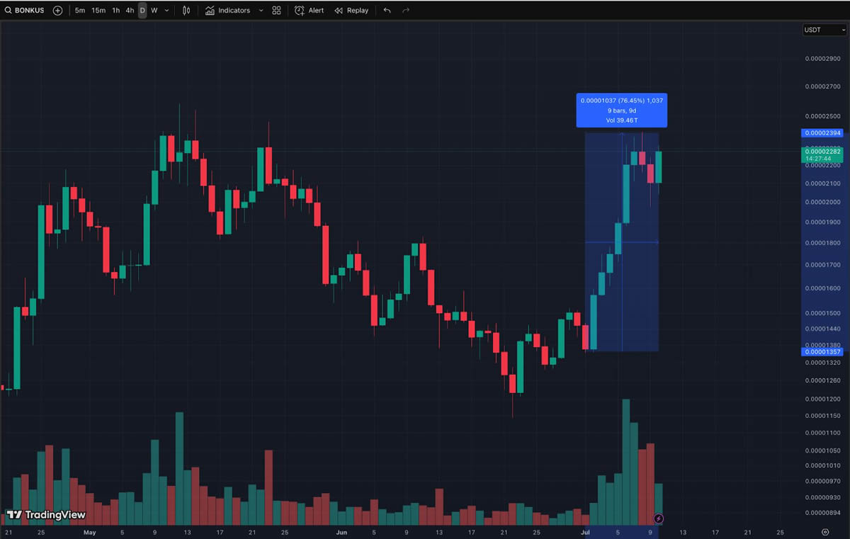 Bonk(BONK)的故事始于2022年,当时Solana正处于低谷期。作为最早一批在Solana上兴起的memecoin之一,BONK在2023年至2024年间实现了价值数百倍的增长,成为了Solana memecoin复兴的代表。经历了6月22日跌至两个月低点后,BONK在短短七天内就强势上涨了70%以上,表现远超大部分加密货币市场。
