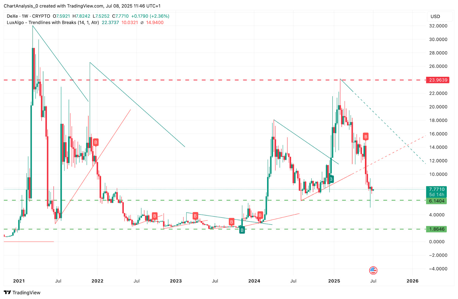 目前DEXE的价格在7.77美元左右徘徊,从6.10美元附近的关键支撑位反弹回来。自2023年以来,这个区域一直是一个强有力的反转点。