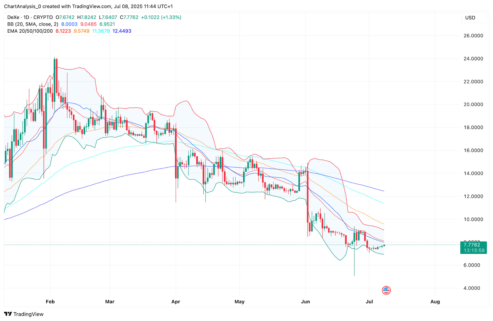 2025年,DEXE的潜在价格区间为低点6.00美元,均价9.20美元,高点11.80美元。目前价格在7.77美元附近交易,自6.10美元附近的主要支撑位反弹。