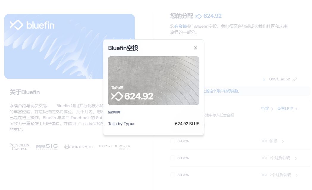 虽然$TYPUS代币已经进行了TGE并且完成了第一轮空投,但基于Sui生态近期的热度,不同协议之间仍然存在相互激励的可能。上图是Sui生态上去中心化交易所Bluefin给予Typus的空投。