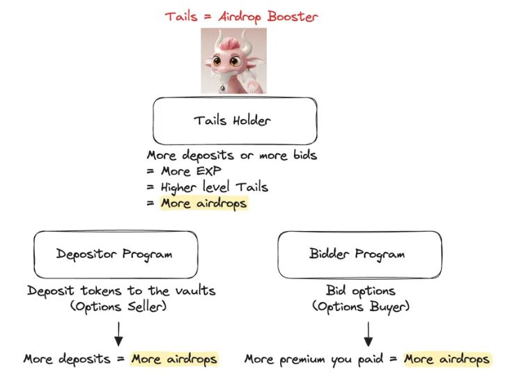 Tails是一个动态NFT,可以理解为积分等级凭证。当用户作为期权的卖方或买方,或者参与了SAFU,都会获得EXP经验值,用来喂养Tails进行升级。同样,Tails也可以在二级市场上进行买卖。