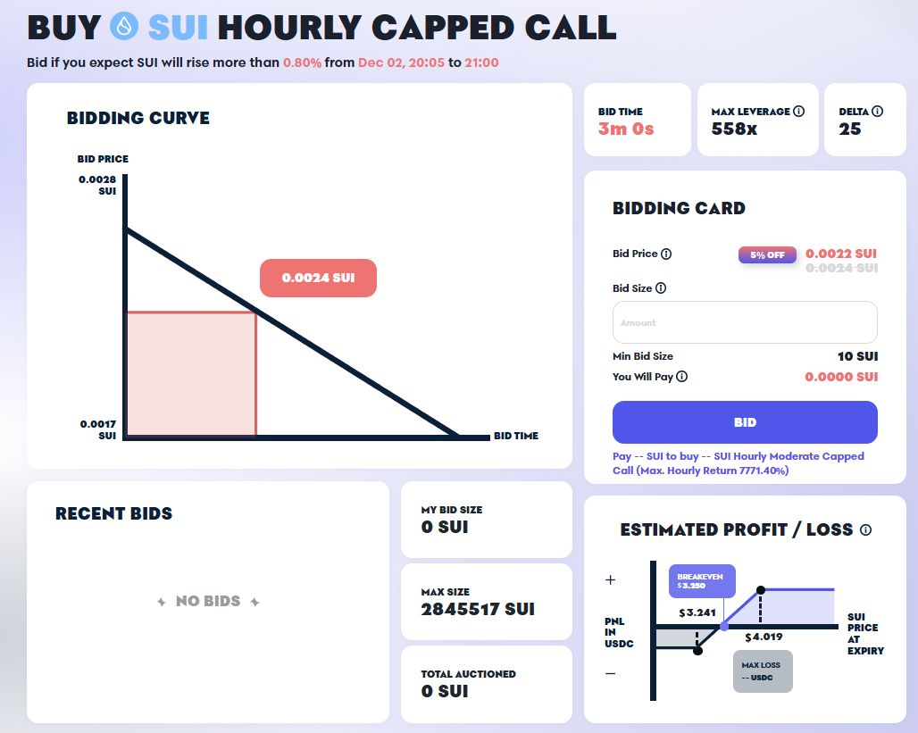 简单来说,如图所示,该期权品种下的最大规模为2845517个SUI。在认购期结束时,有两种可能性:一种是最大规模全部被认购,那么单张合约的价格将是最低(最后)一笔拍卖的价格;另一种是最大规模没有被全部认购,那么将以0.0017作为单张合约的价格。