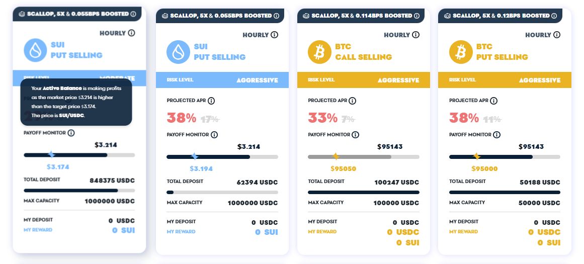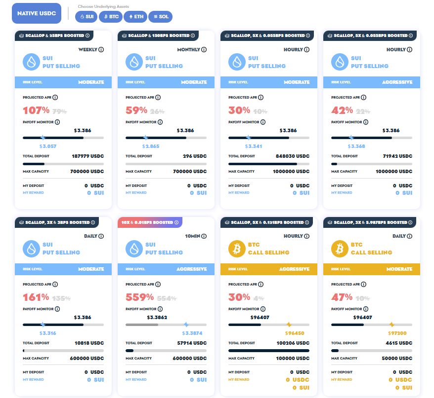在品种方面,Typus不仅提供了BTC、ETH、SOL、SUI等主流代币,还包括Sui生态中的SCA、NAVX等协议代币,以及BLOB等Meme币。这基本涵盖了Sui生态用户的所有需求,而且对于某些特定品种的金库,还会获得额外的倍率加成,从而获得更多收益。
