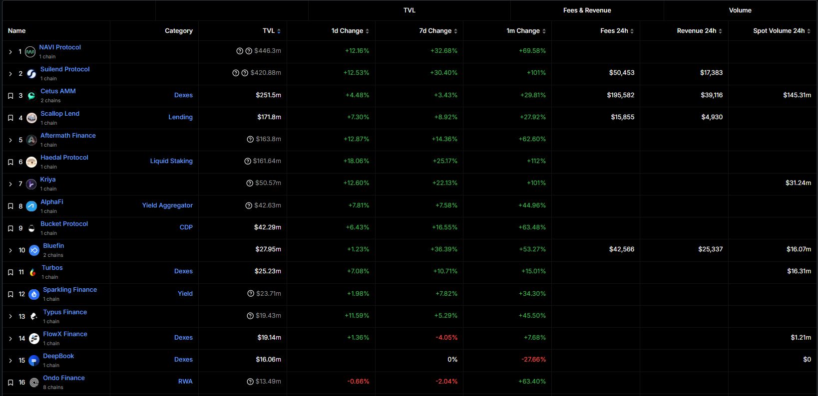 Typus的TVL在Sui生态中排名第13位,近一个月增长了45%,即使在周和日级别上,增长率也超过了大多数其他协议。【1】