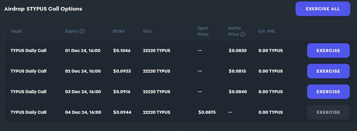 对于符合特定条件的用户,本次空投除了$TYPUS外,还提供了一定规模$TYPUS的每日看涨期权。这种期权设计意味着,只有当代币价格触及某个水平后,用户才能获得额外的$TYPUS。这样不仅能给早期用户额外的激励,也在一定程度上降低了一次性空投带来的代币抛压。