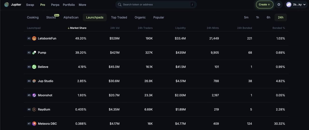 LetsBONK.fun目前在Solana生态系统发行平台中拥有超过49.2%的市场份额,并且24小时交易量达到5.29亿美元。这些指标显示了不仅是用户的迁移,更是市场领导地位的转变。