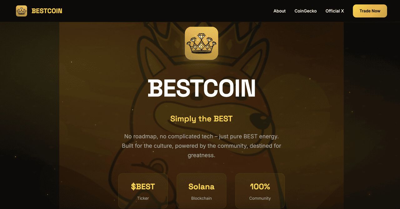 BestCoin 以没有路线图、最小化品牌以及一个显然具有讽刺意味的名称进入市场,这正是它成功的原因。最初作为对代币排行榜文化的讽刺,它出乎意料地获得了动力,因为早期交易者欣然接受了它的简单性和元幽默。仅在两天内,它突破了RAY 奖励门槛,并成为了一个如何通过速度、讽刺和社群信号超越传统行销的范例。如今,BestCoin 正在被Solana 迷因币观察者密切关注,寻找有潜力成为病毒性代币的巧妙二波代币。