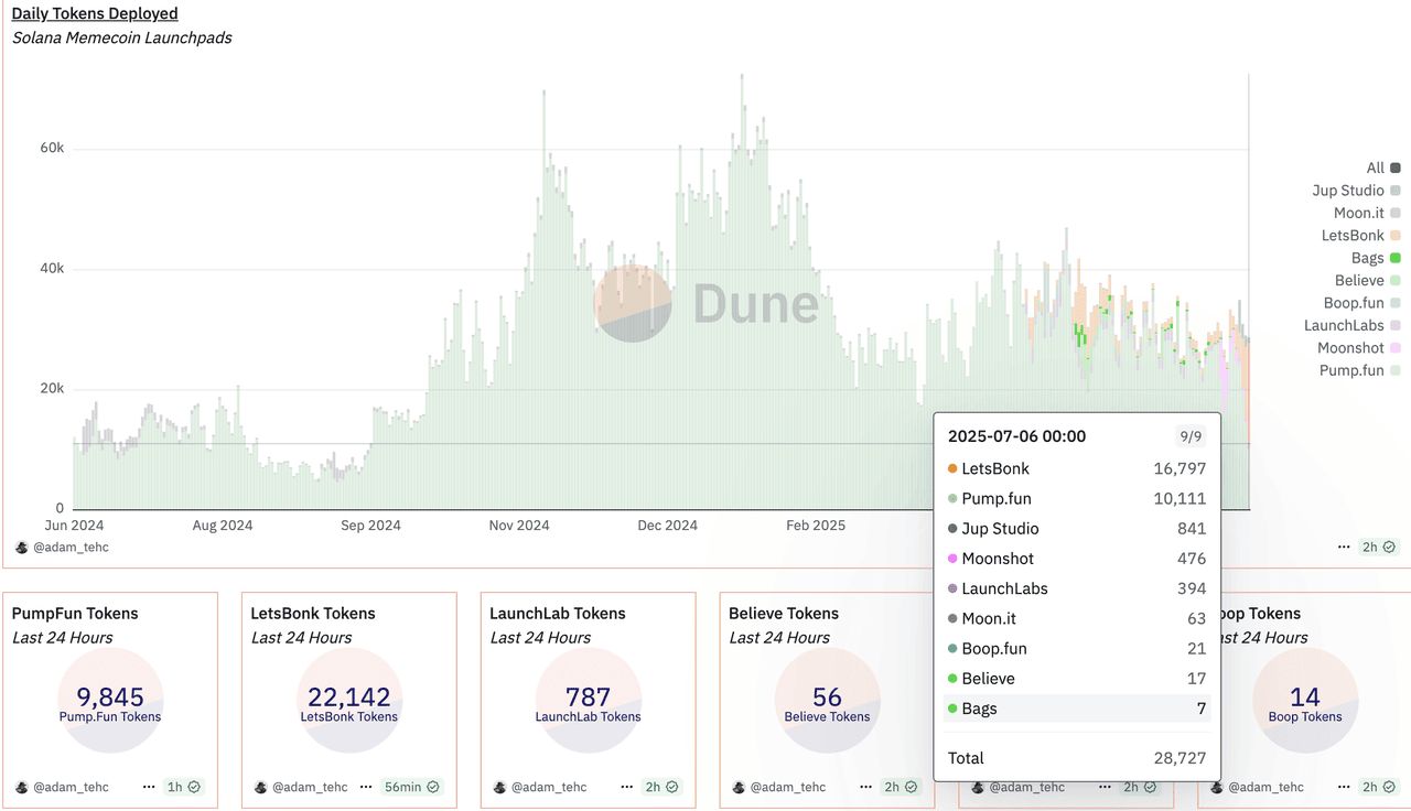 2025年7月7日,LetsBONK.fun在24小时内推出了22,142个Solana代币,而Pump.fun则推出了9,845个。这是自Pump.fun成立以来,首次有平台在每日代币数量上超越Pump.fun。