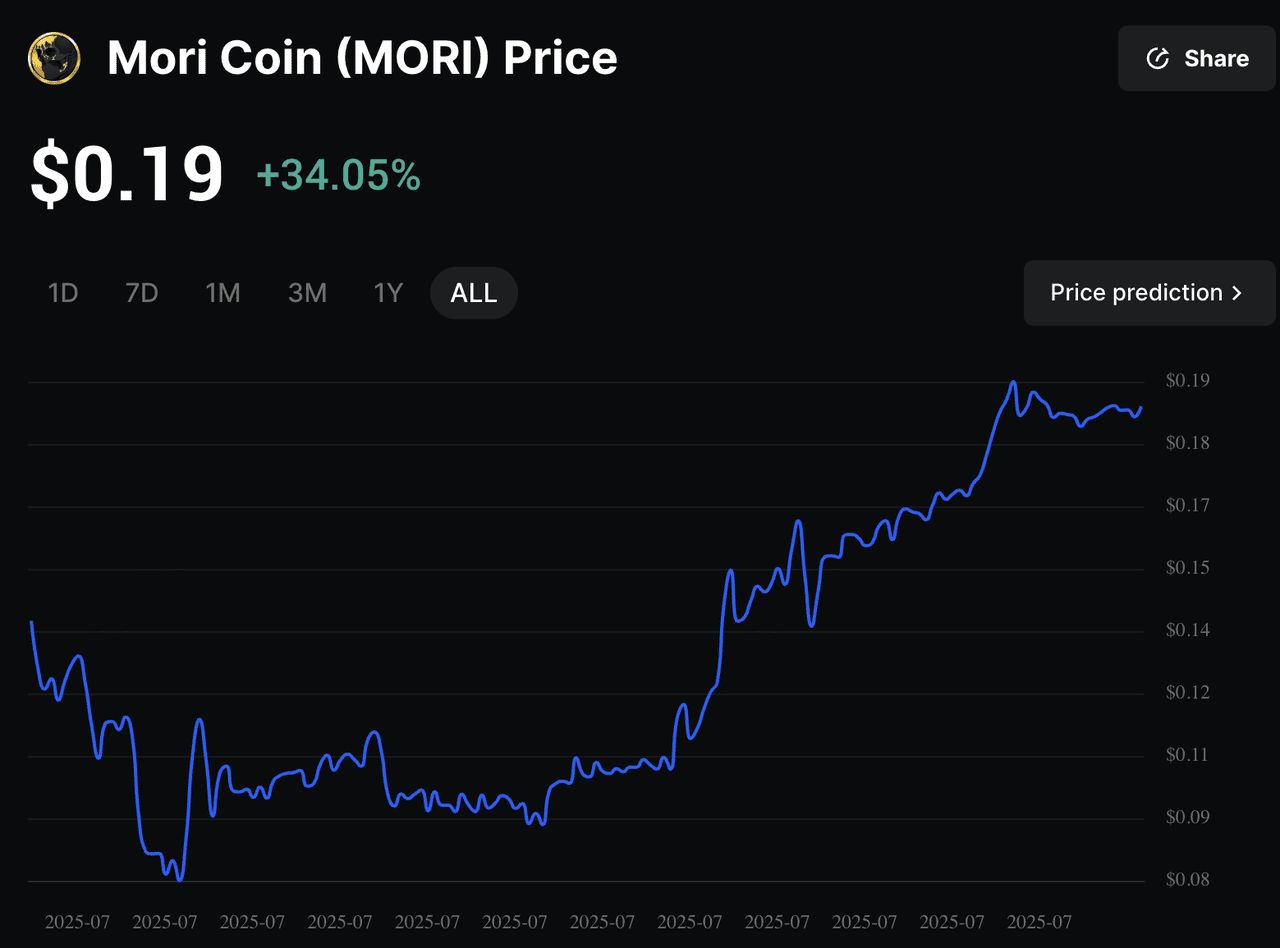 MORI Coin (MORI)可以说是2025年7月Solana生态系统中备受瞩目的模因币之一。这个代币围绕着神秘的"Professor Moriarty"建立,他是一位以黑暗网络神秘感和哲学讽刺著称的俄语YouTuber,正是这种独特的魅力吸引了众多加密交易者和文化爱好者的关注。自2025年6月下旬推出以来,该代币已经上涨超过750%,甚至曾在一天之内暴涨300%,目前市值已经超过1.72亿美元。