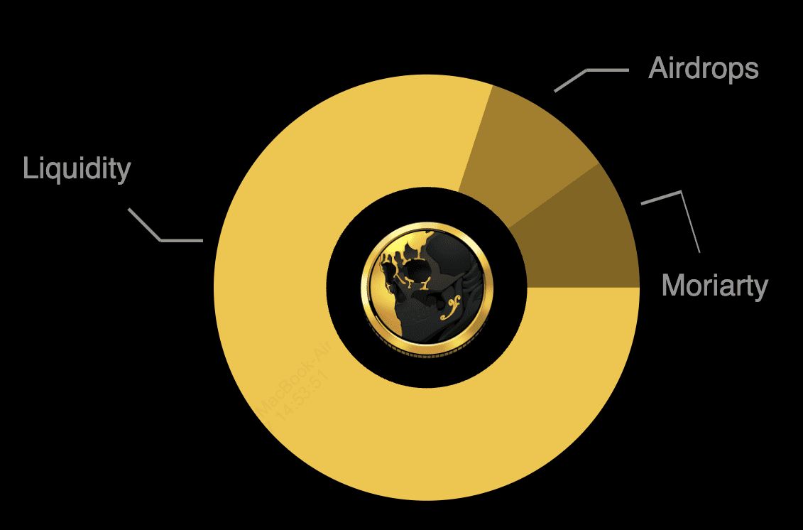 $MORI的总供应量上限为10亿枚,分配如下:80%用于流动性并锁仓一年,10%分配给莫里亚提教授并锁仓一年,10%用于空投、营销与合作伙伴。此外,每笔交易会征收1%的费用进入《非凡绅士联盟》的国库,用于资助未来项目和社群活动。